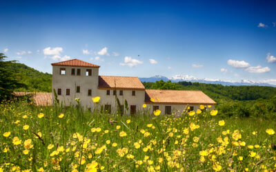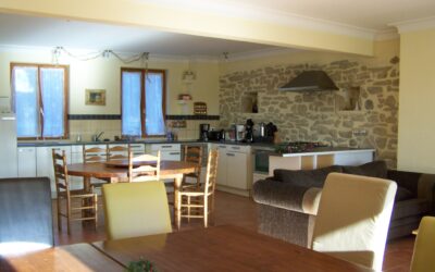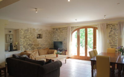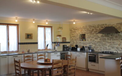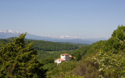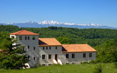 Via twee grote boogdeuren komt u op het terras met uitzicht op de appel- en notenbomen, weilanden en bos. In de verte ziet u de toppen van de Pyreneeën.
