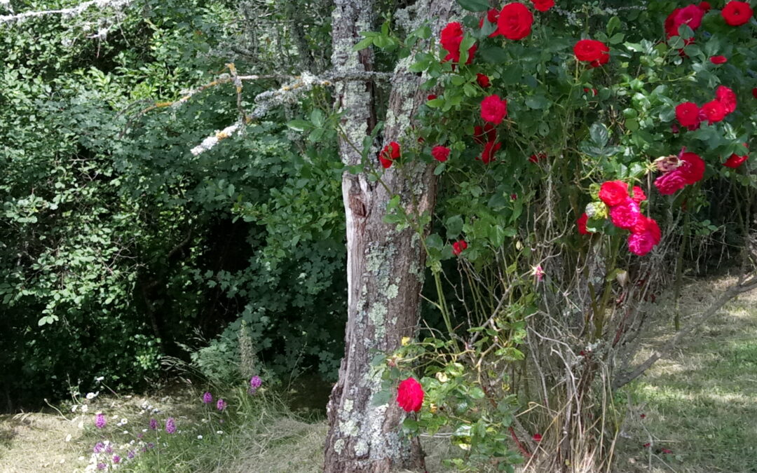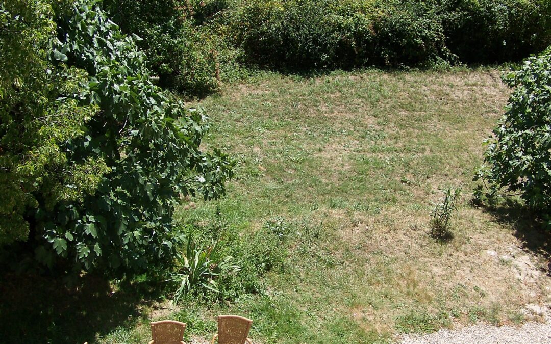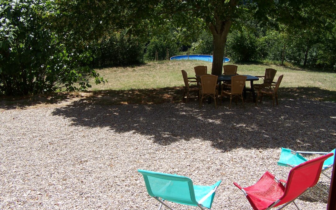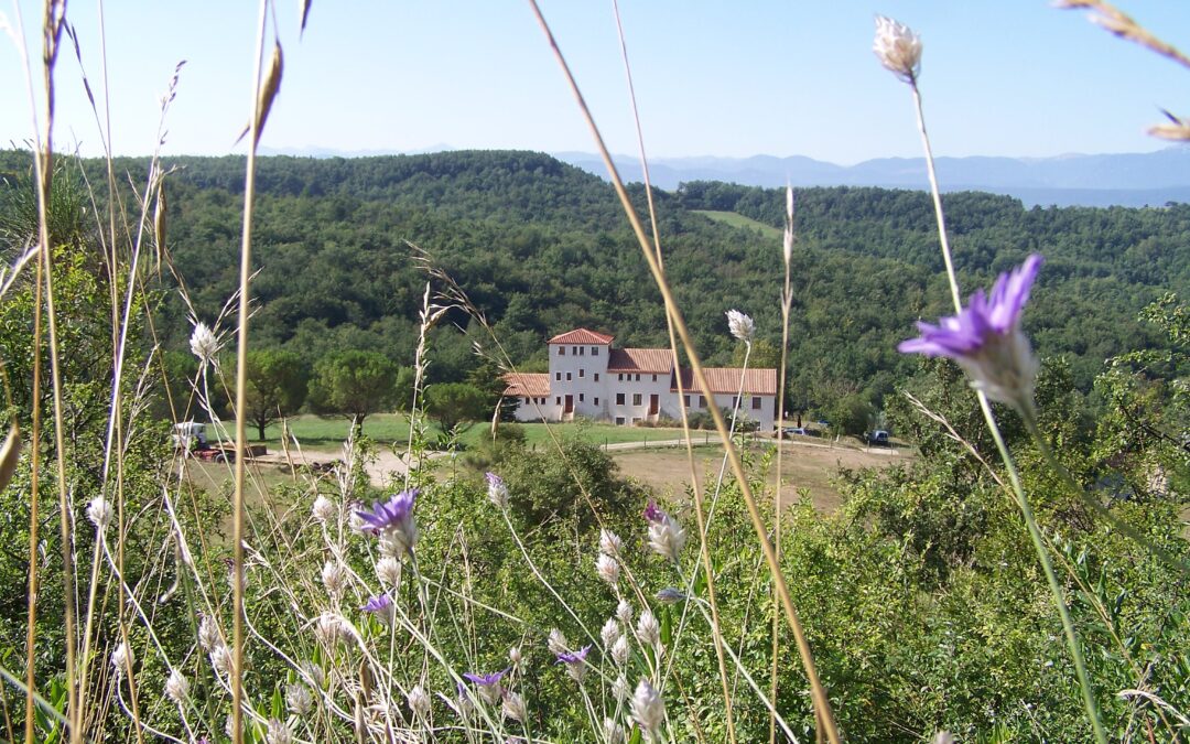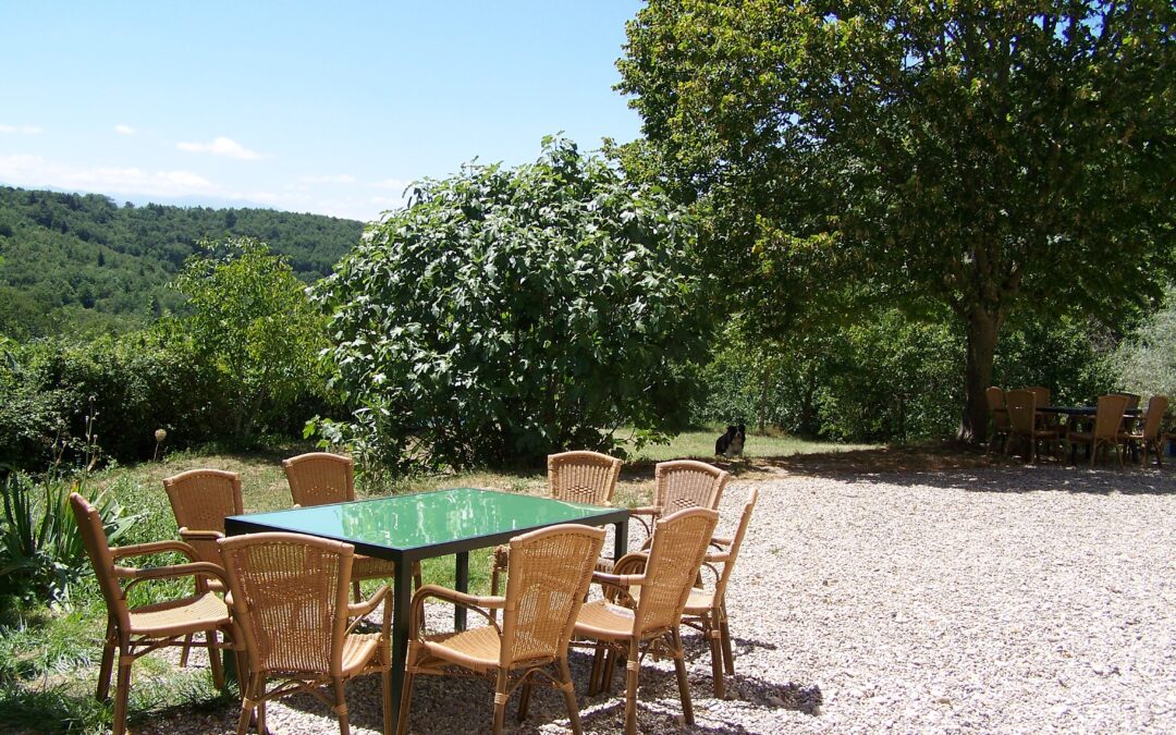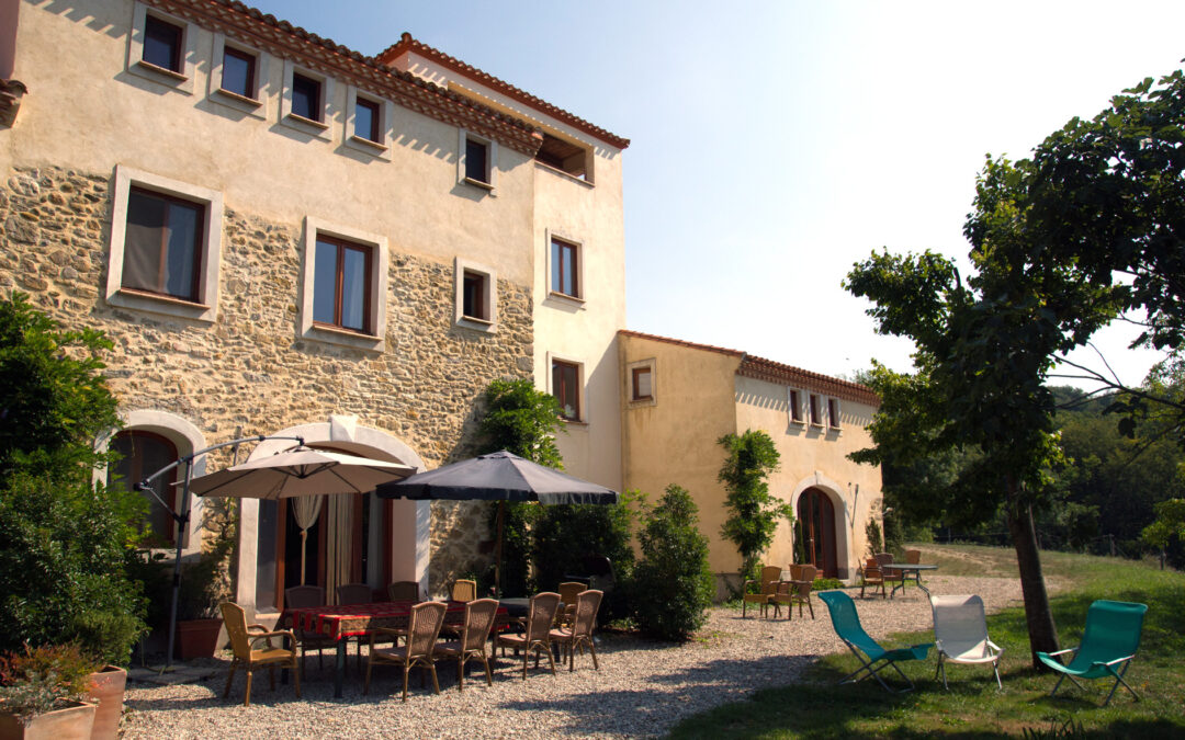 Via twee grote boogdeuren komt u op het terras met uitzicht op de appel- en notenbomen, weilanden en bos. In de verte ziet u de toppen van de Pyreneeën.